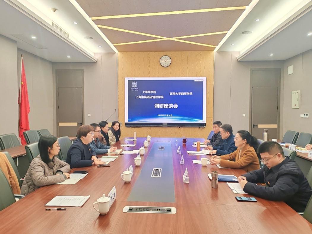 12月16日上午,上海商学院上海洛桑酒店管理学院执行院长胡笑寒率队来访,学院领导班子成员及相关科室负责人参加调研。双方分别介绍了各自办学基本情况,并围绕中外合作办学经验分享、“十五五”事业发展规划、党建与思政育人、产教融合、校园规划等议题展开了现场交流讨论。