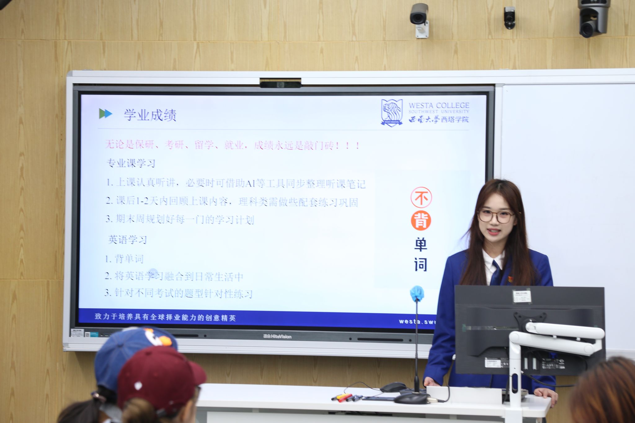 她分享了“课堂专注+课后复盘+期末规划”的三步走学习法,提醒同学们紧跟课堂节奏、及时梳理知识点、合理规划复习时间;同时建议大家将英语学习融入日常,提前备战雅思等语言考试,持续提升英语应用能力,为学术研究和未来发展筑牢基础。