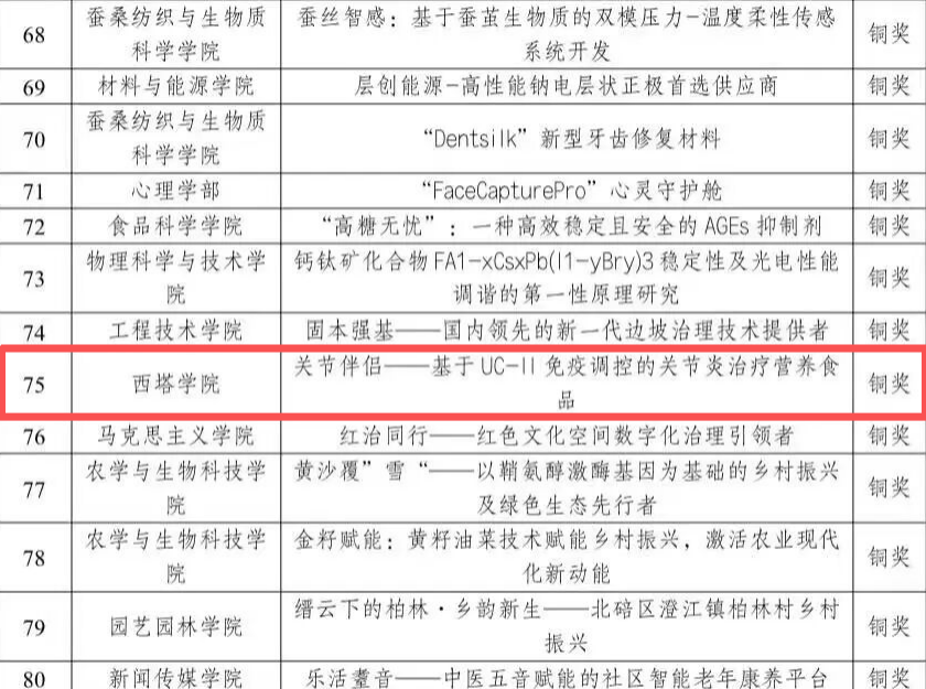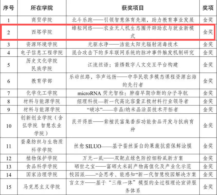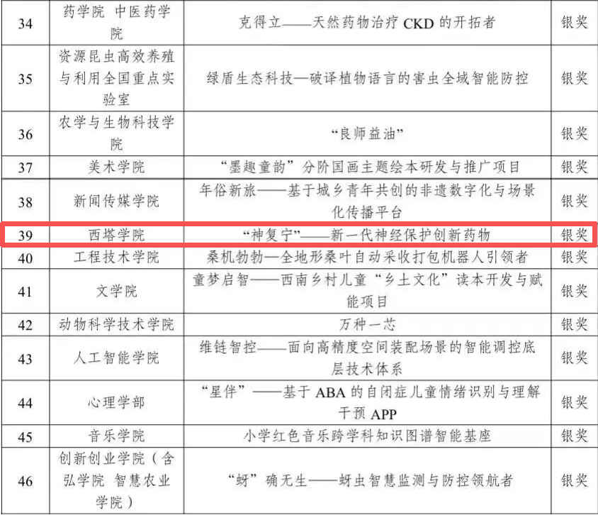 我院学子积极参赛,最终揽获校级金奖1项、银奖1项、铜奖1项。其中,项目“蜂耘网络——农业无人机生态圈开辟助农与就业新模式”获得金奖;“‘神复宁’——新一代神经保护创新药物”获得银奖;“关节伴侣——基于UC-II免疫调控的关节炎治疗营养食品”获得铜奖。同时,学院荣获本届竞赛“优秀组织奖”。
