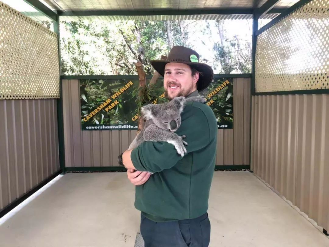 考拉园中,我们与抱在饲养员身上的小考拉合影。一天中十八九个小时都在睡觉的它,有可以拥抱的大树和能吃的叶子就能沉沉睡去。